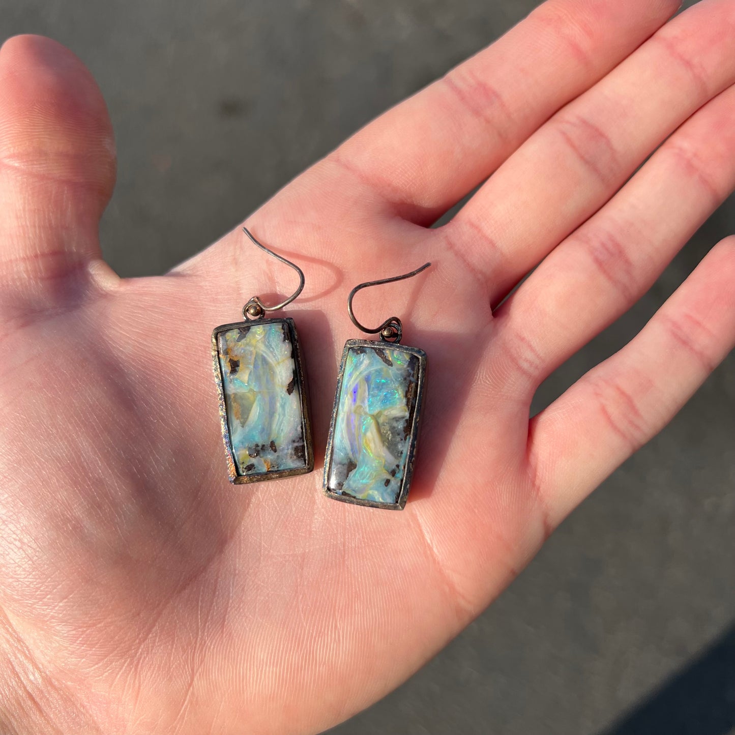 Rustic style boulder opal earrings that radiate in handmade charm. The silver is intentionally left oxidized to fit with this motif. Open back shows the Queensland boulder opal's natural stone matrix.