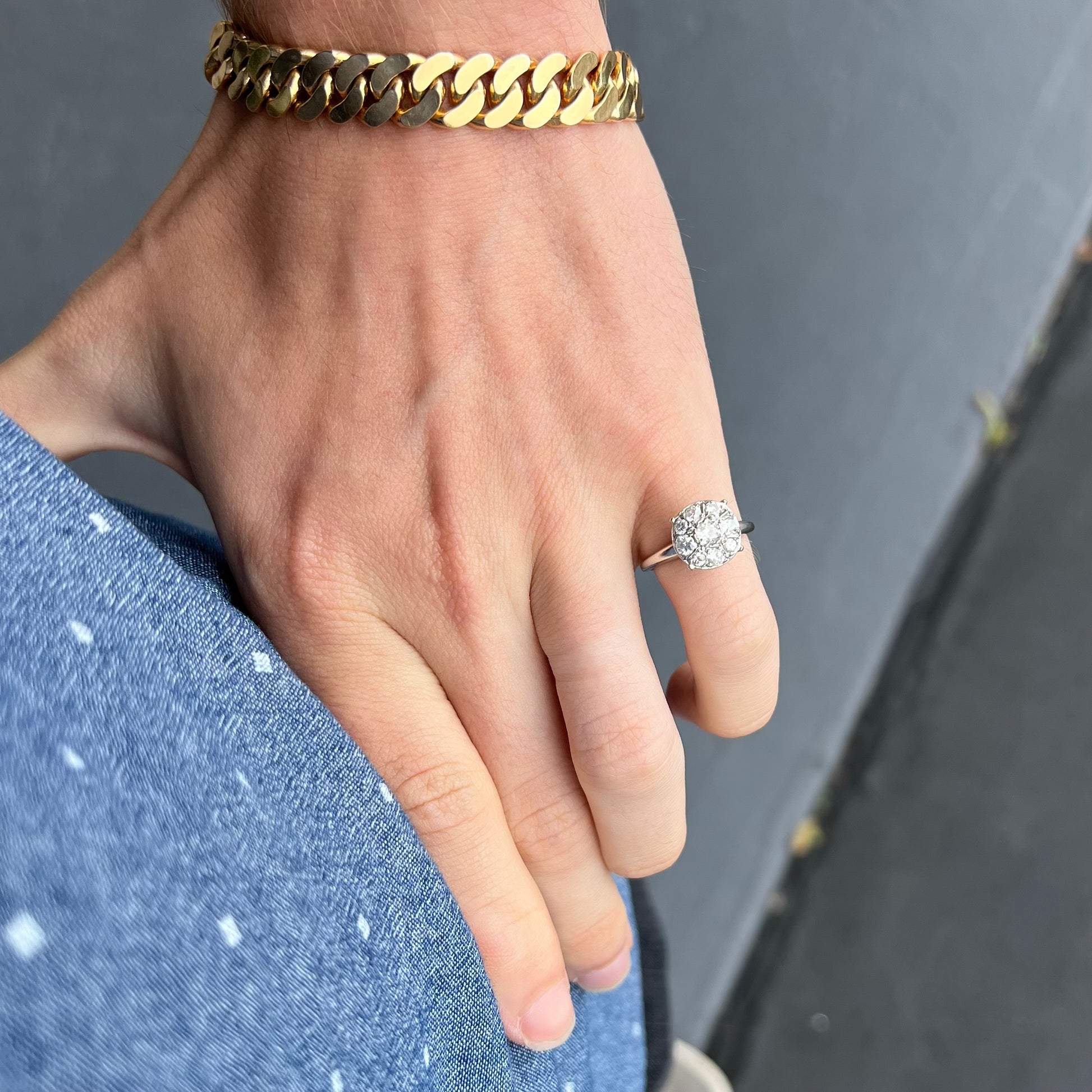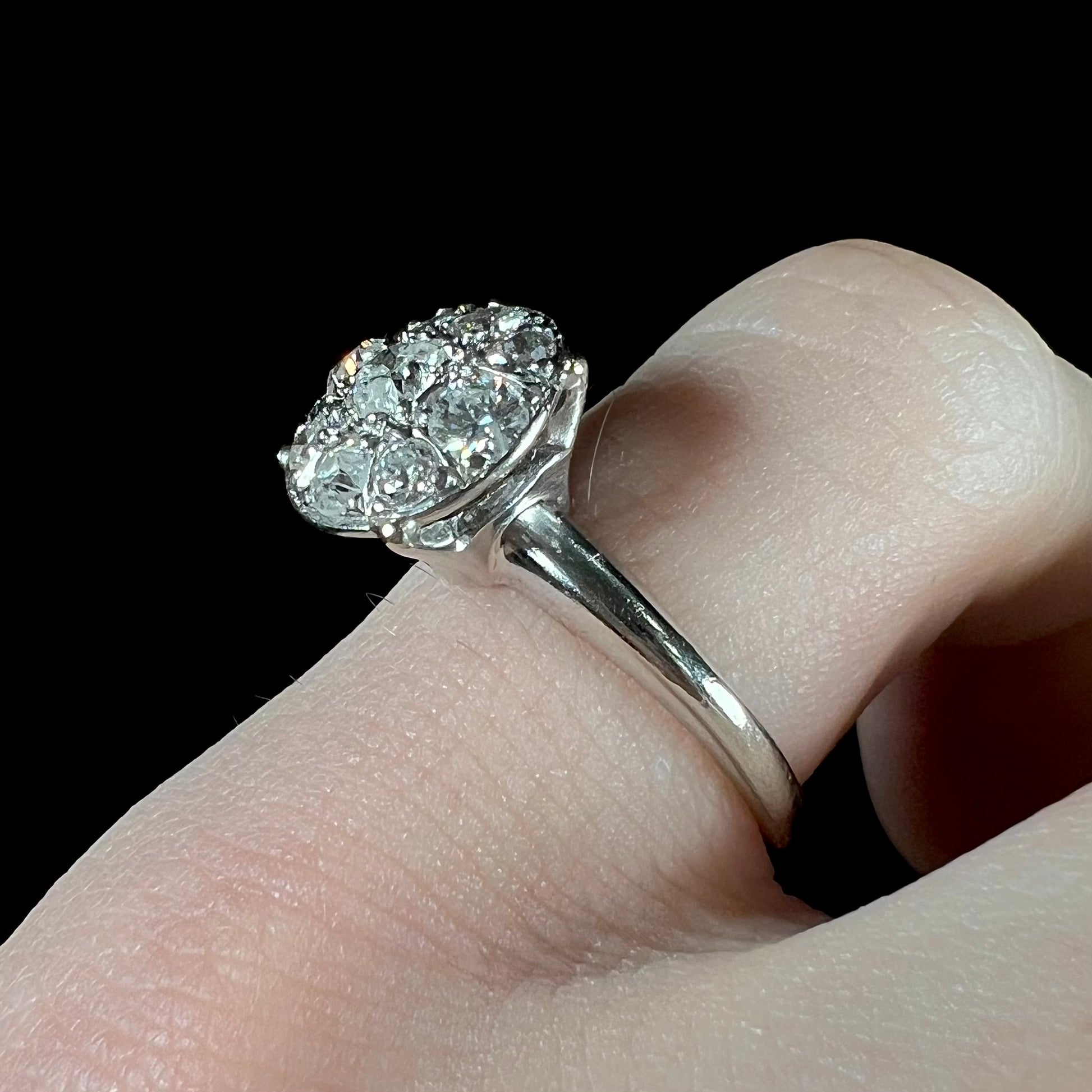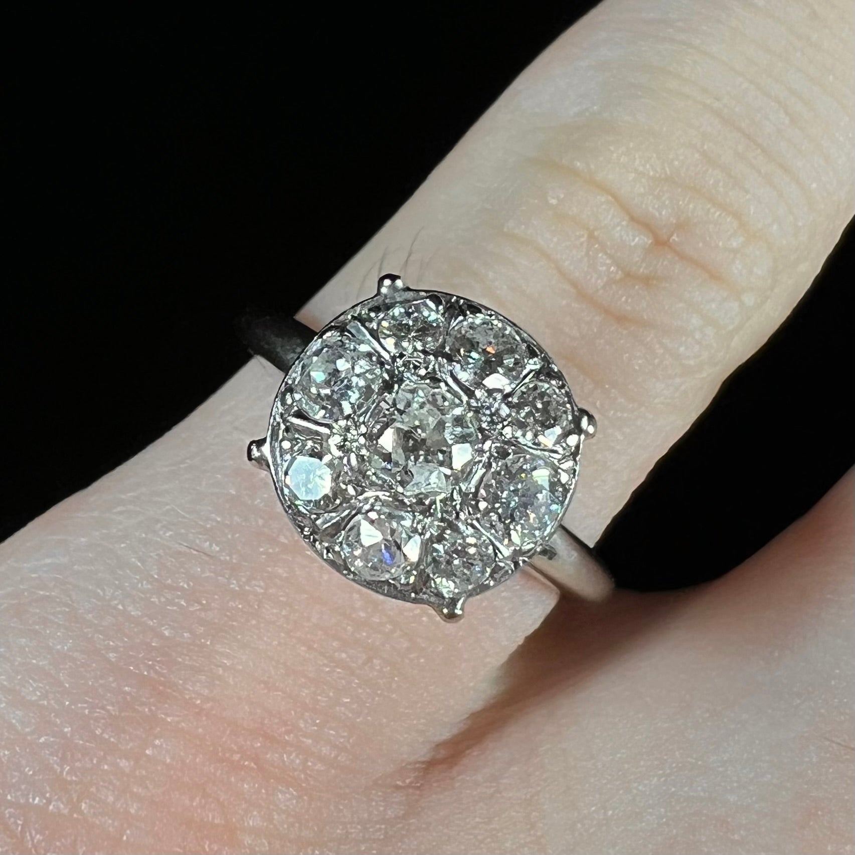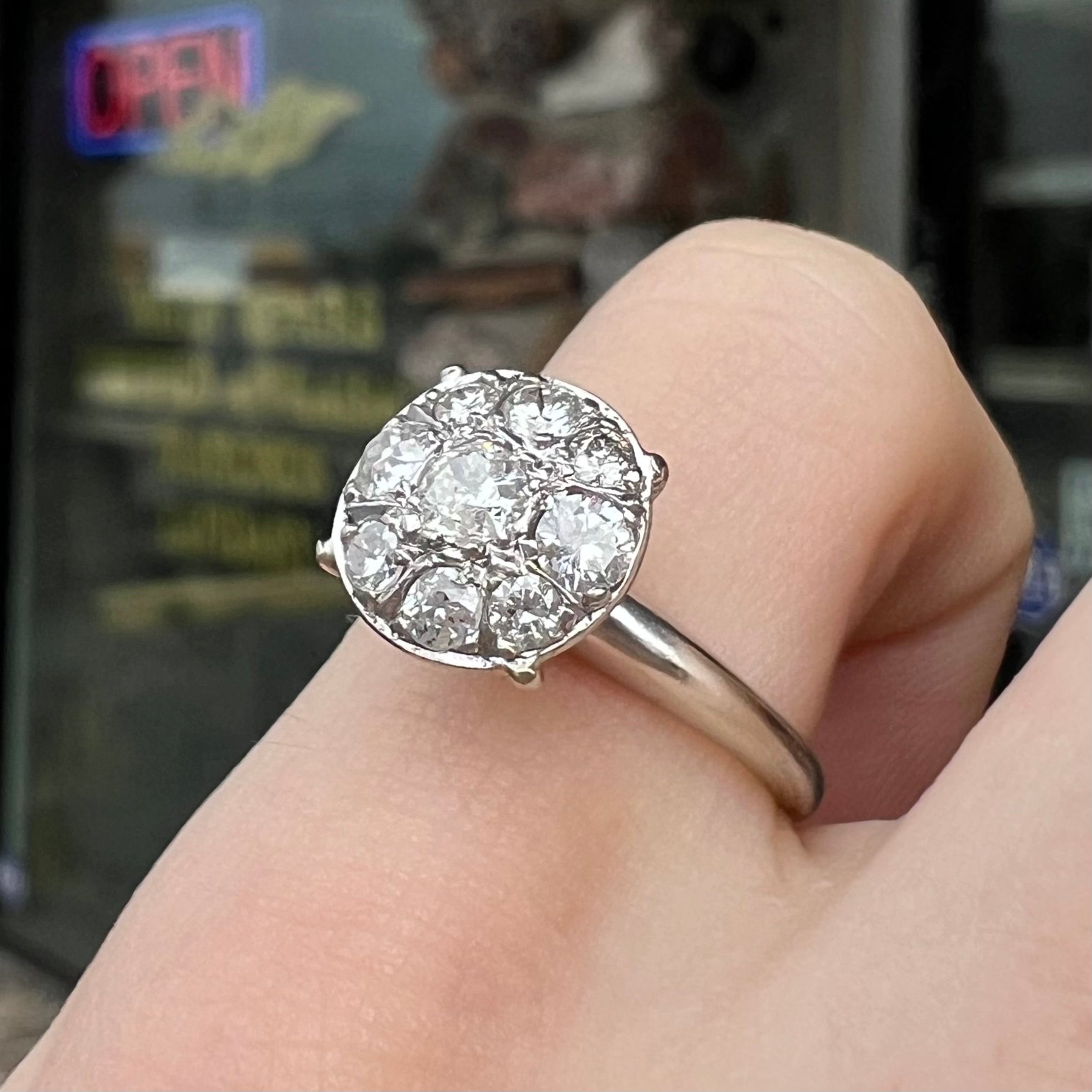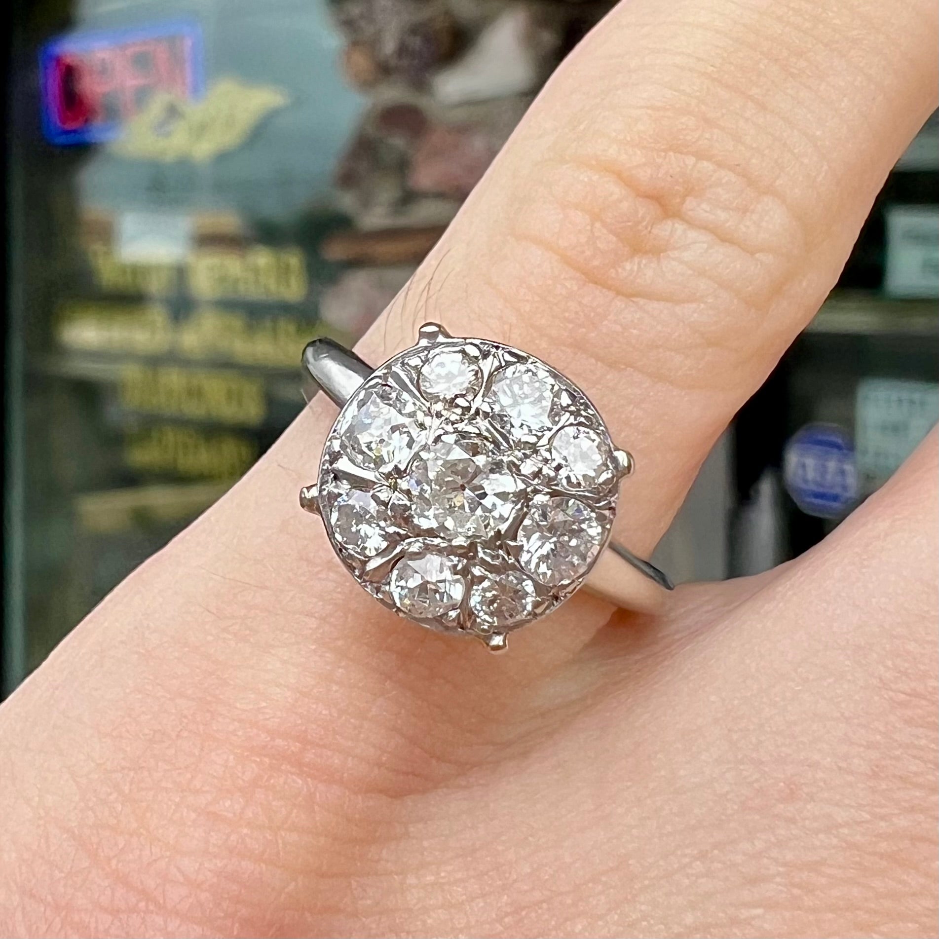 Set with almost three quarters of a carat of natural diamonds, this early 1900's white gold cluster ring is a piece with history. Five of the diamonds are more modern Standard Round Brilliant Cuts, while four (including the center) are Old European Cut; the center diamond has an eye-visible chip, though it is easy to miss amid the charming piece's sparkle. Default size 5.25 US.