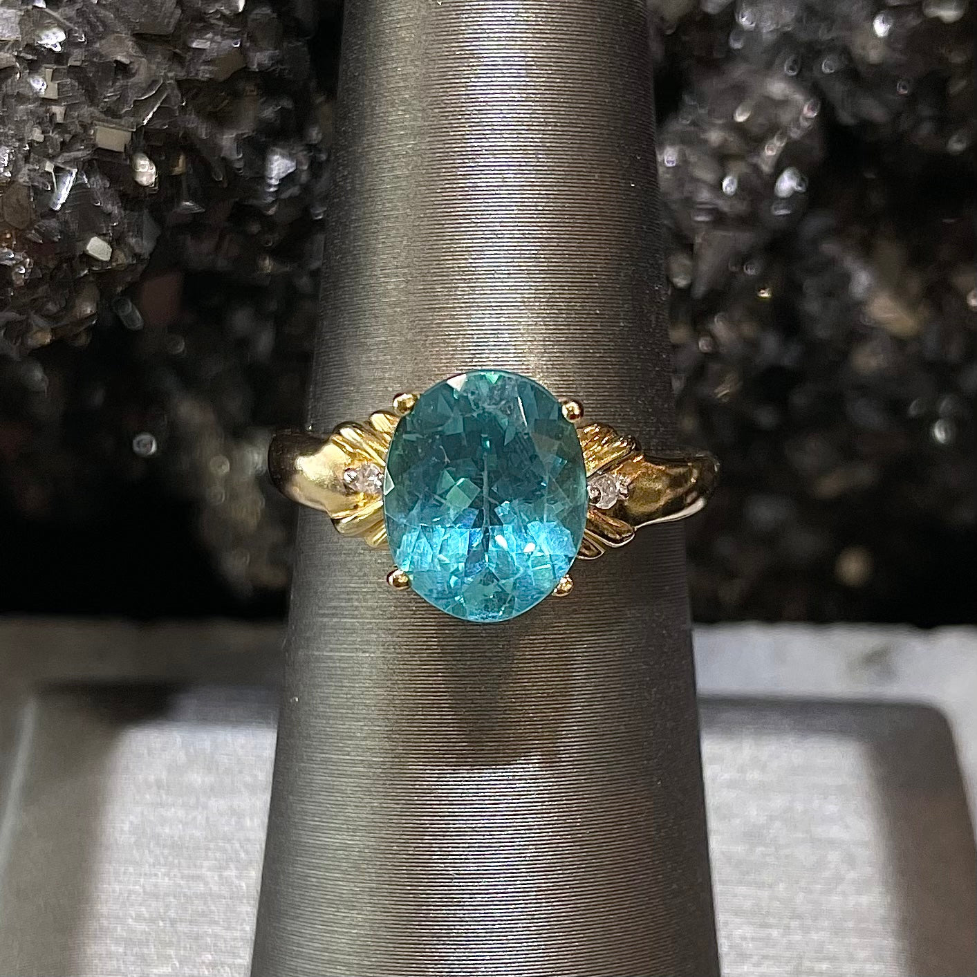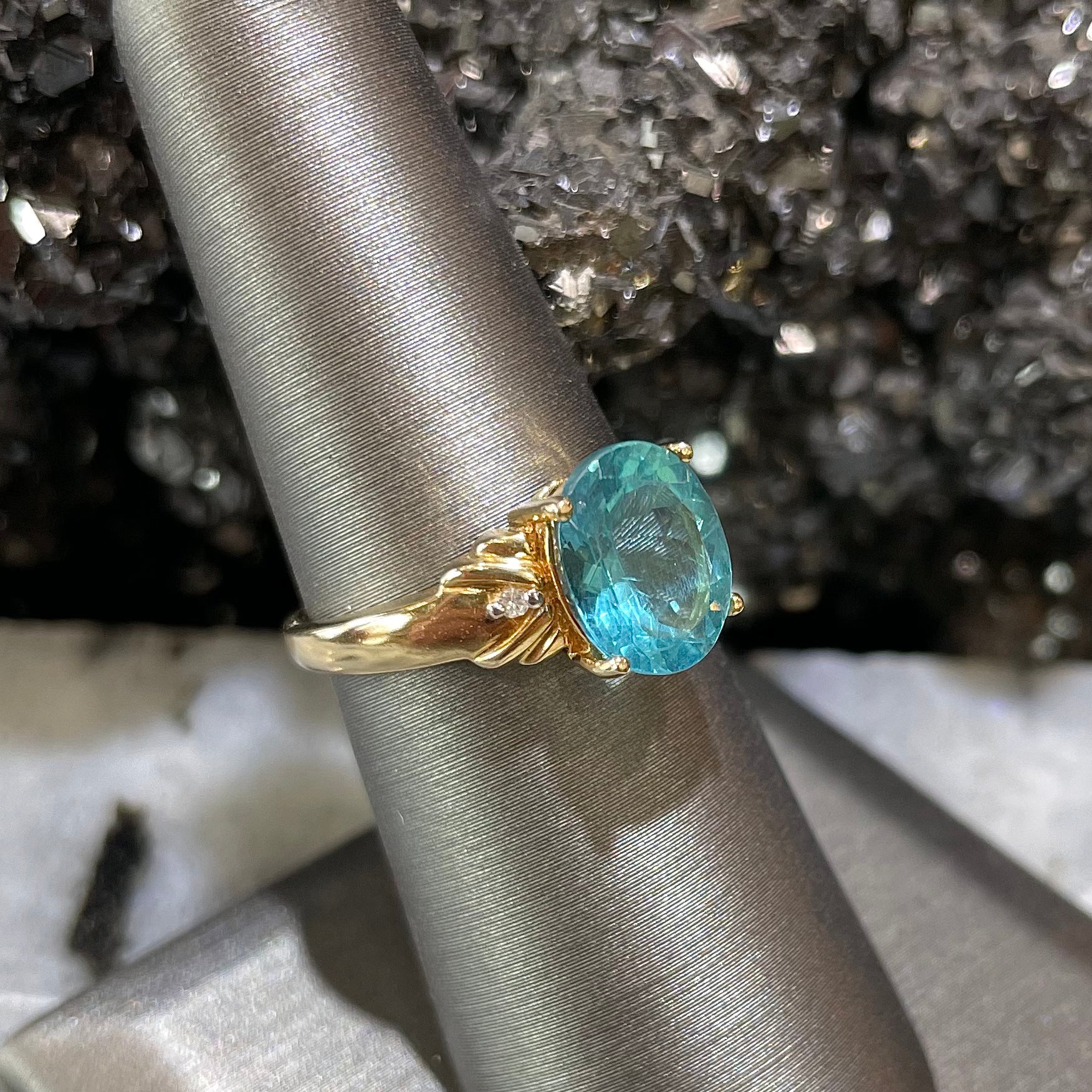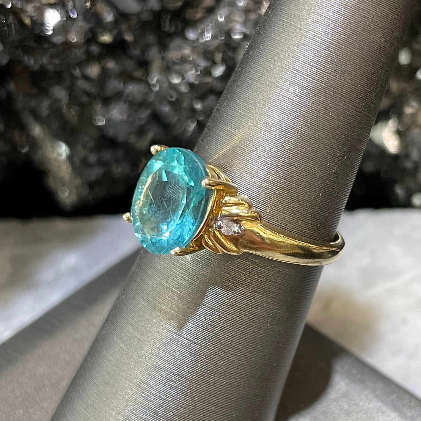Bright blue apatite set in 14kt yellow gold with diamonds.