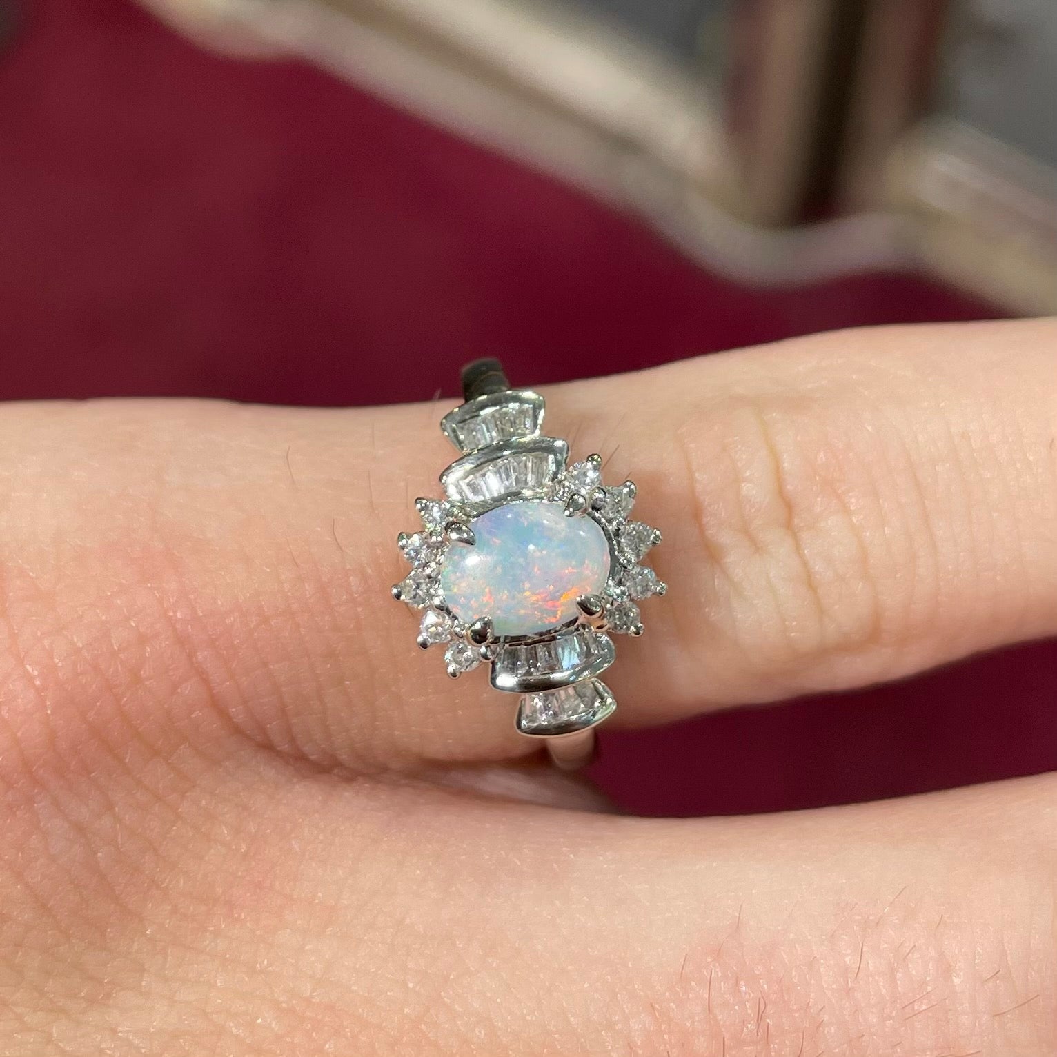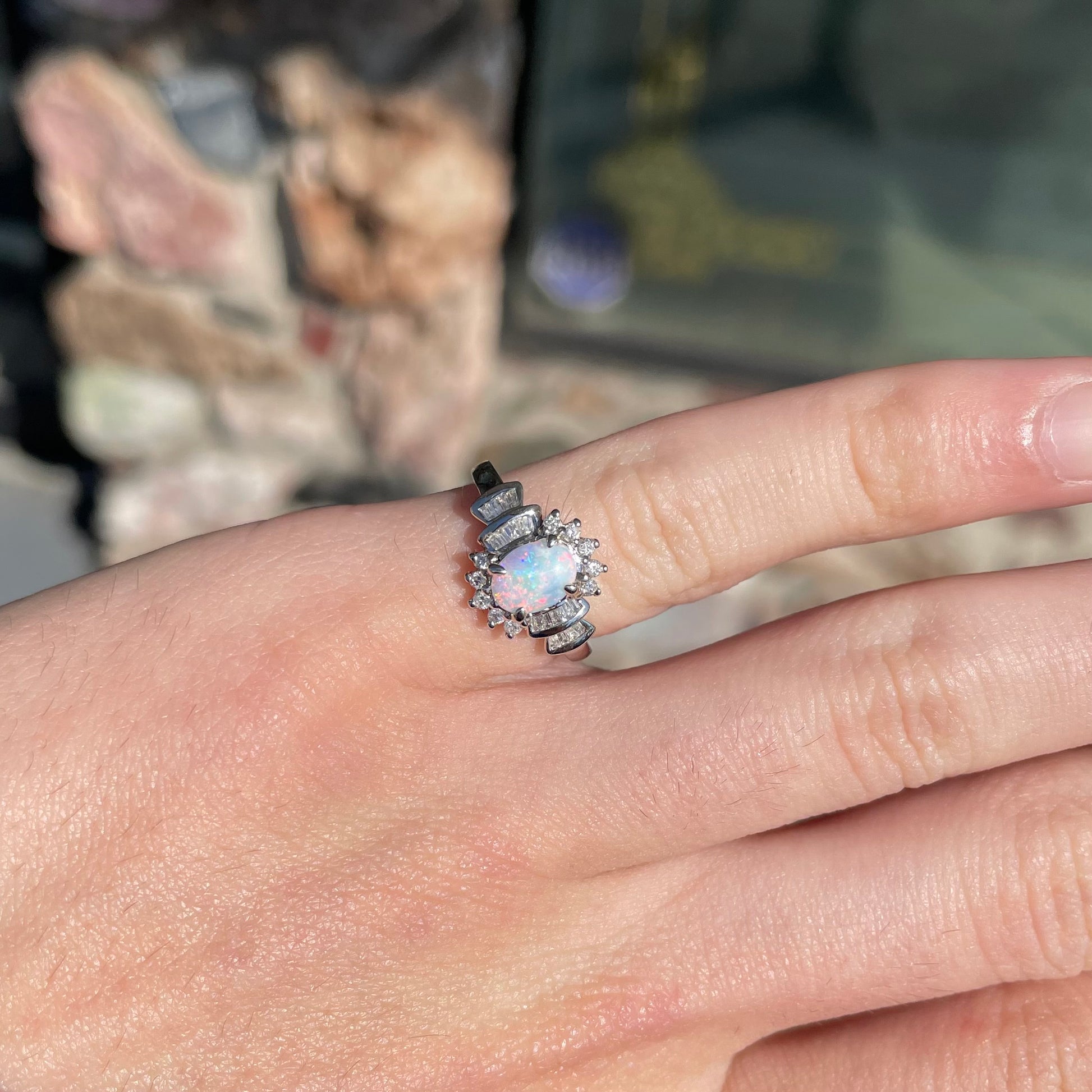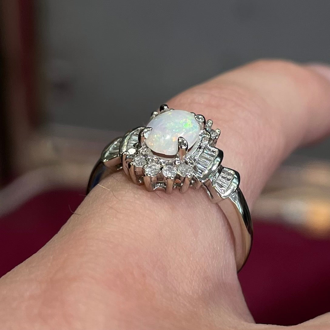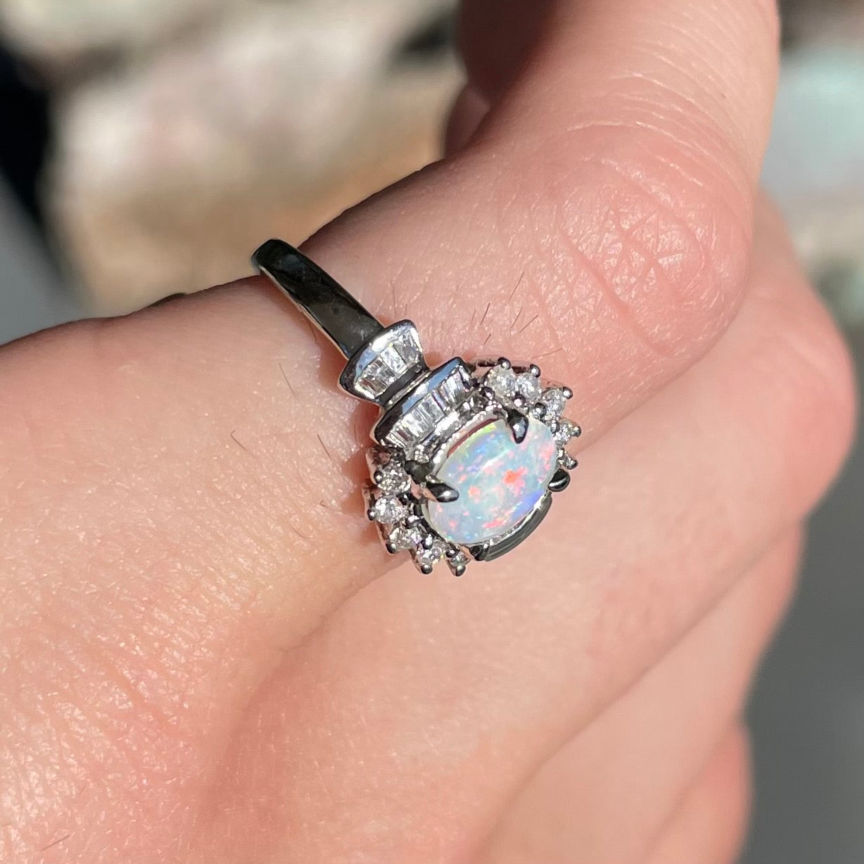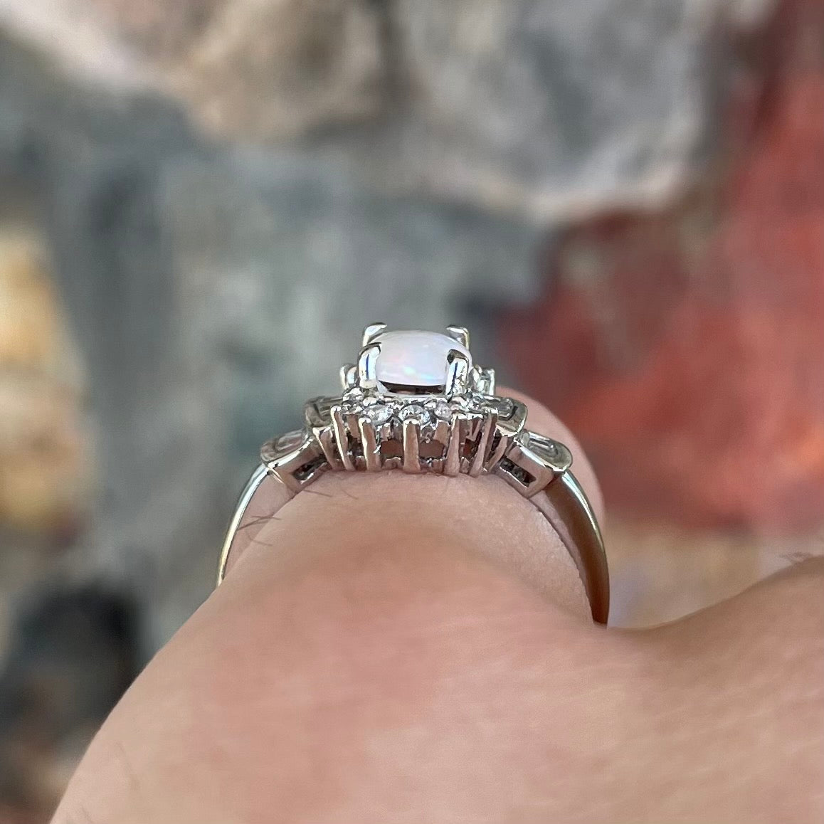 Classic white crystal opal set with diamonds in 14kt white gold. Petite, dainty ring with some flash.
