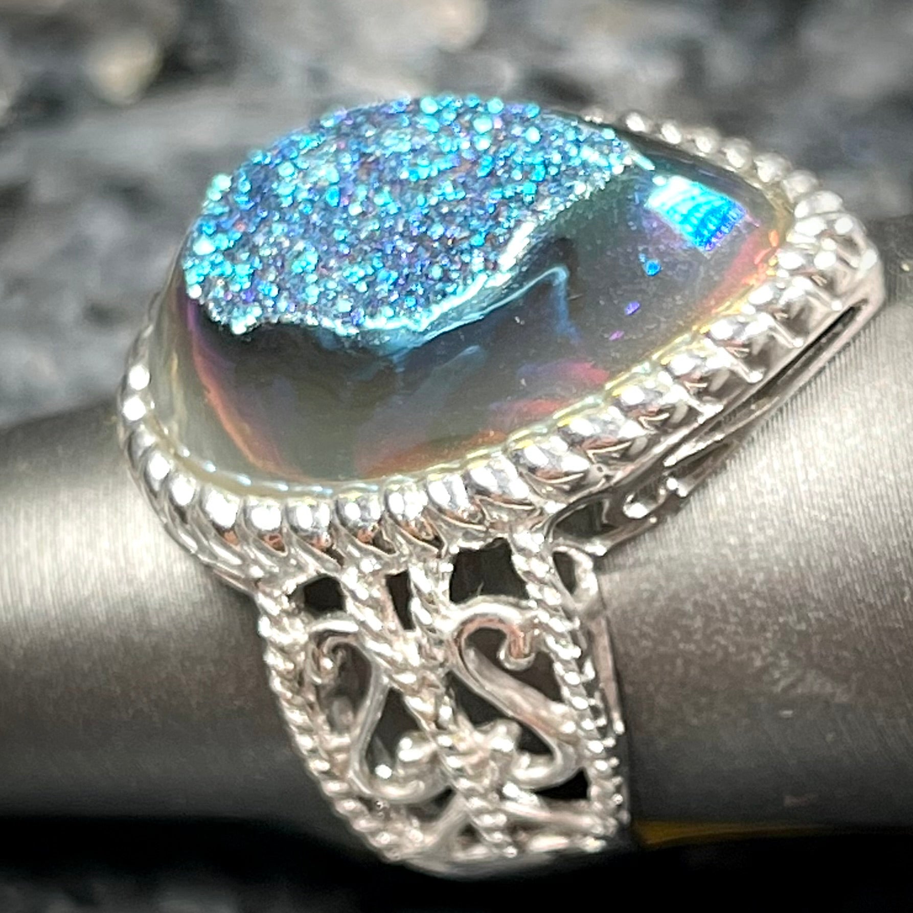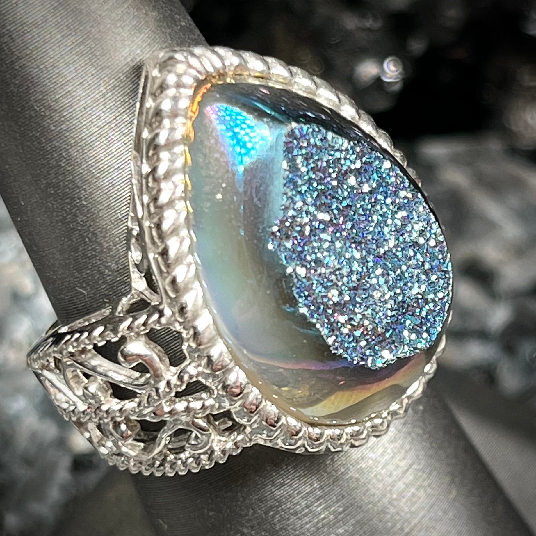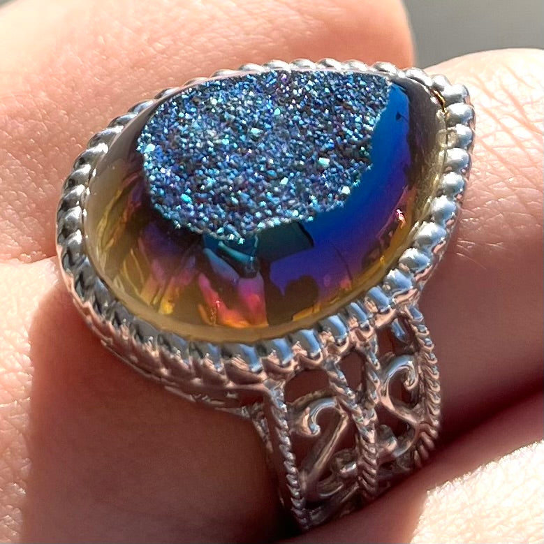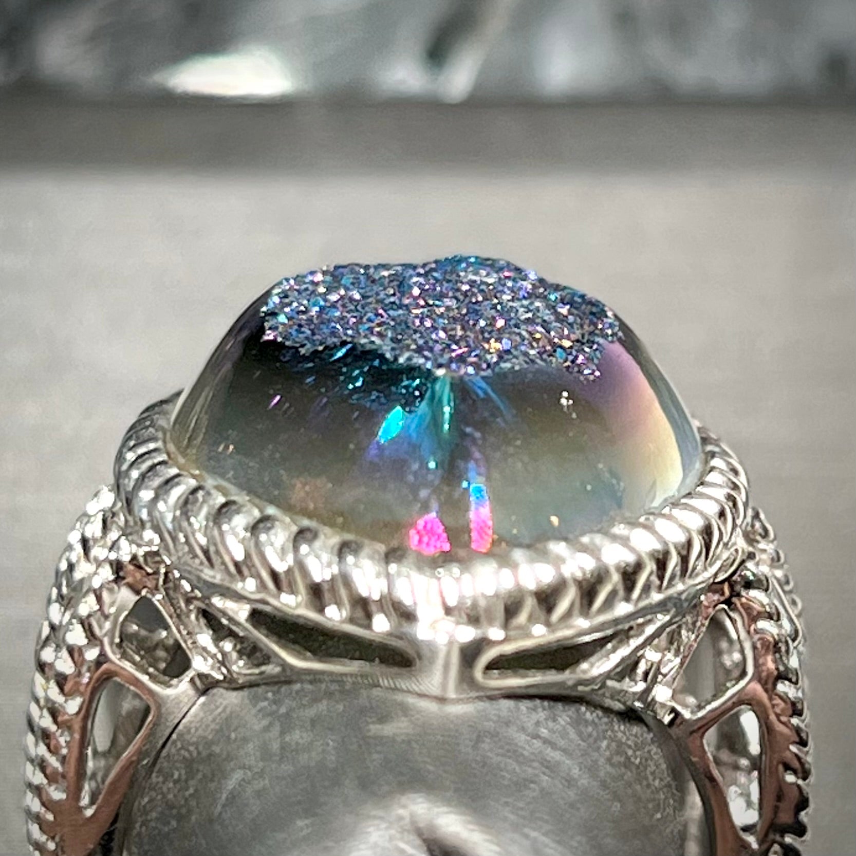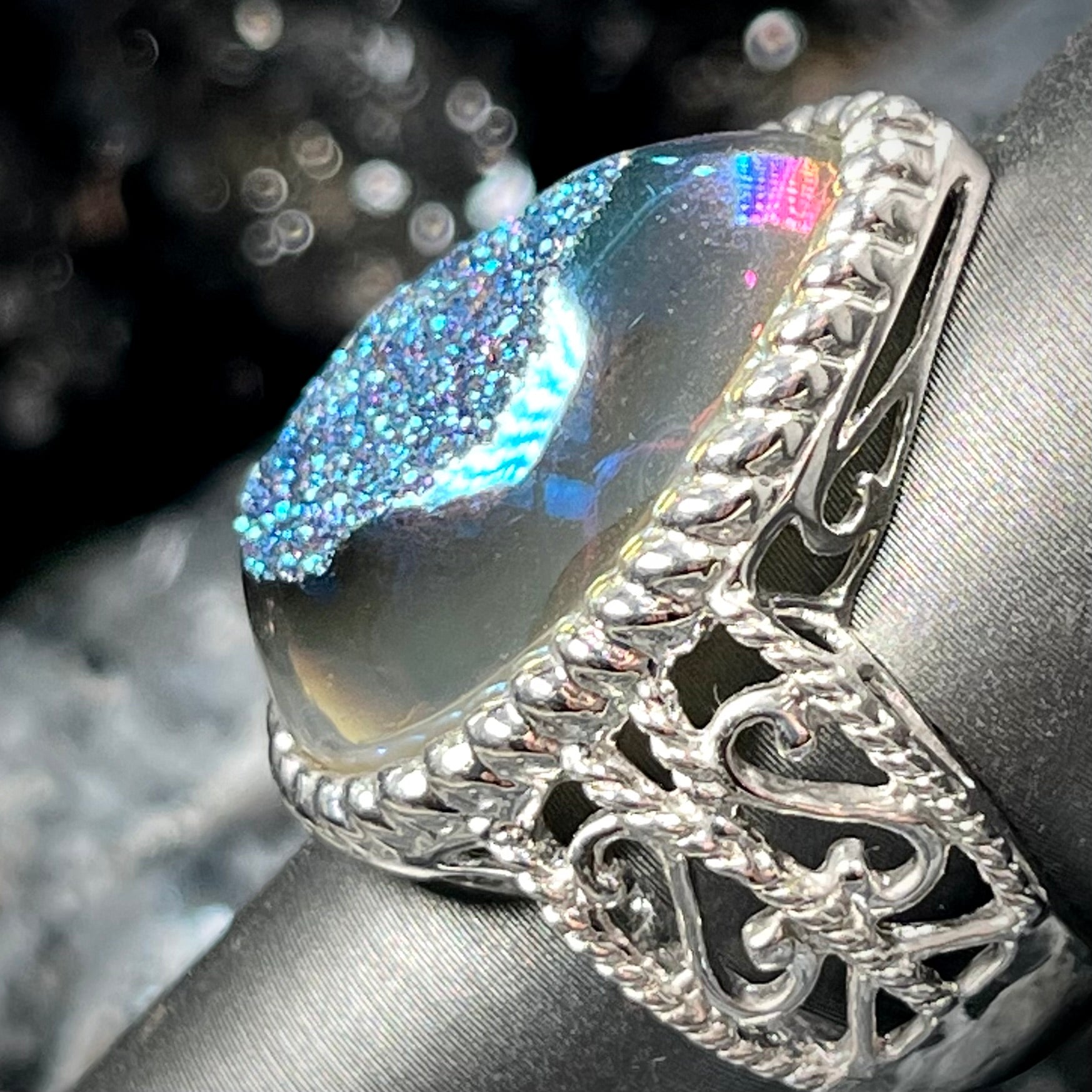 The Setting: Bezel Set Sterling Silver Setting with filigree shank