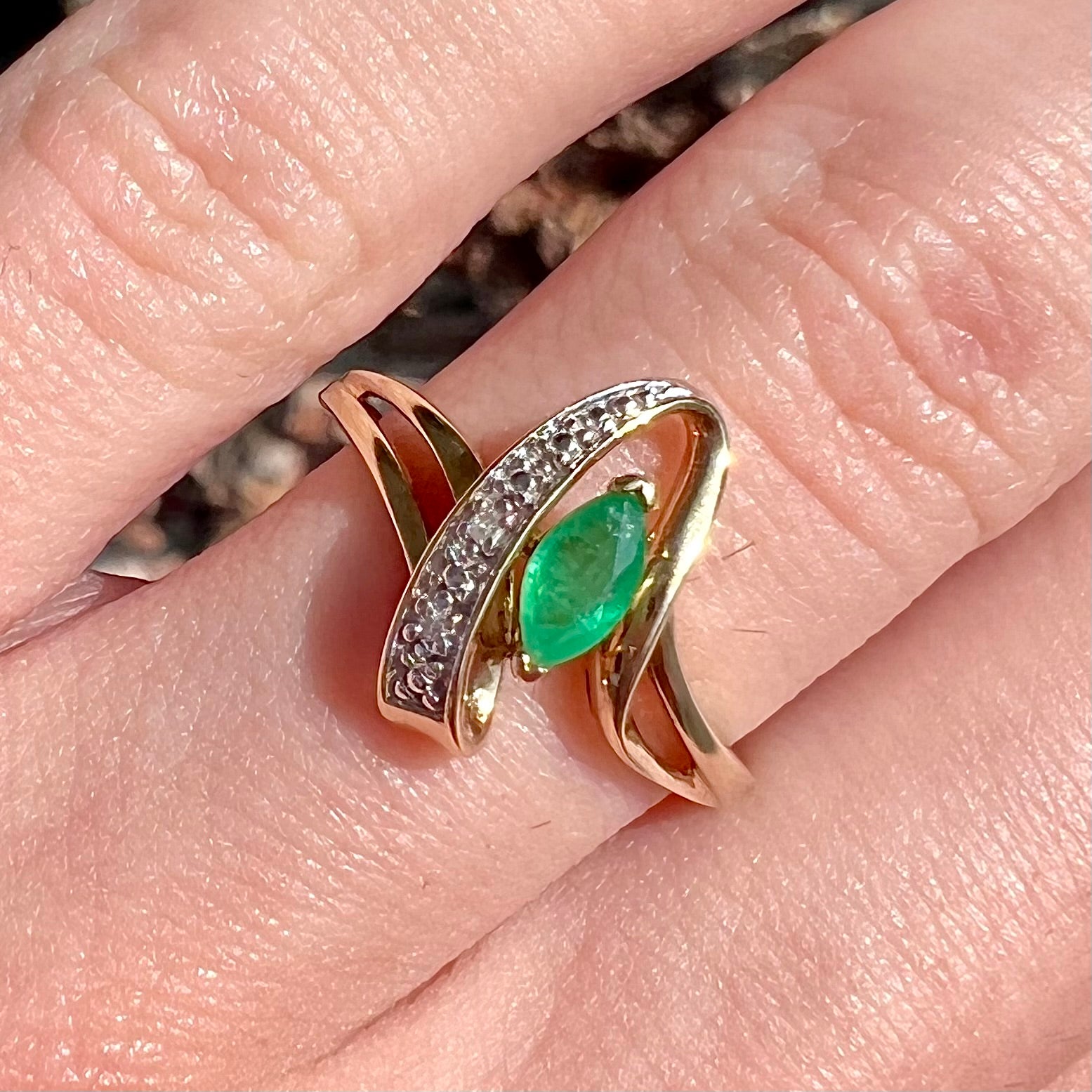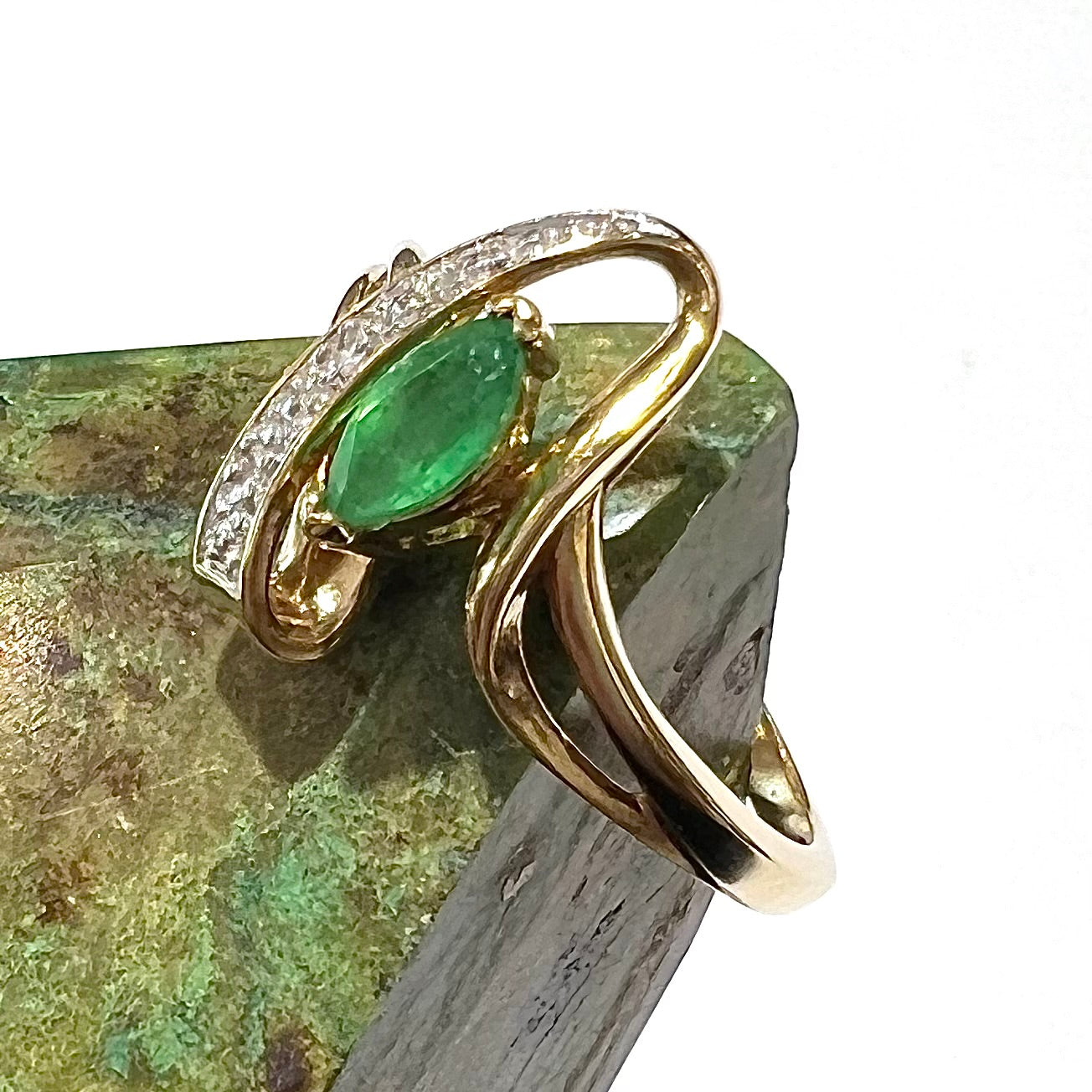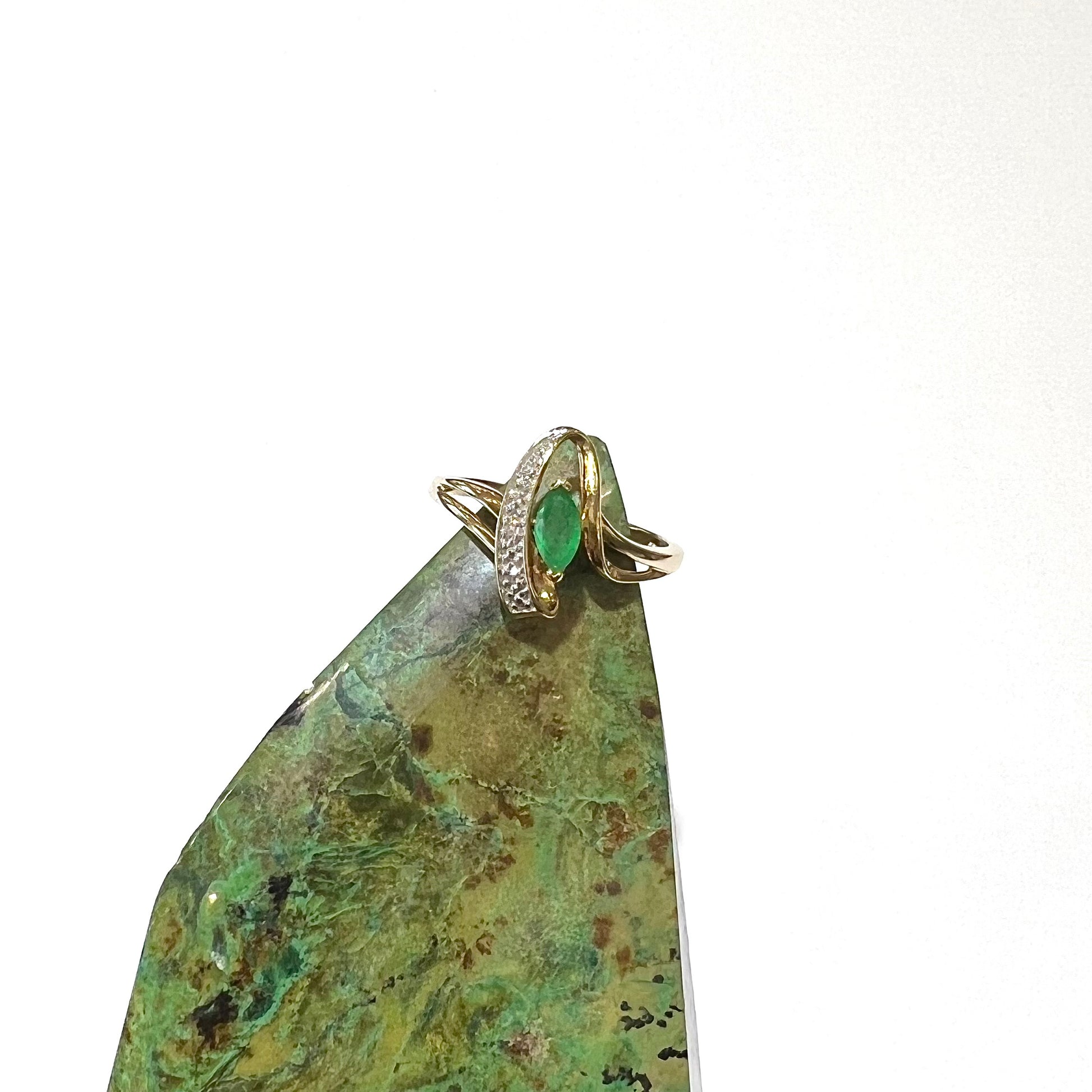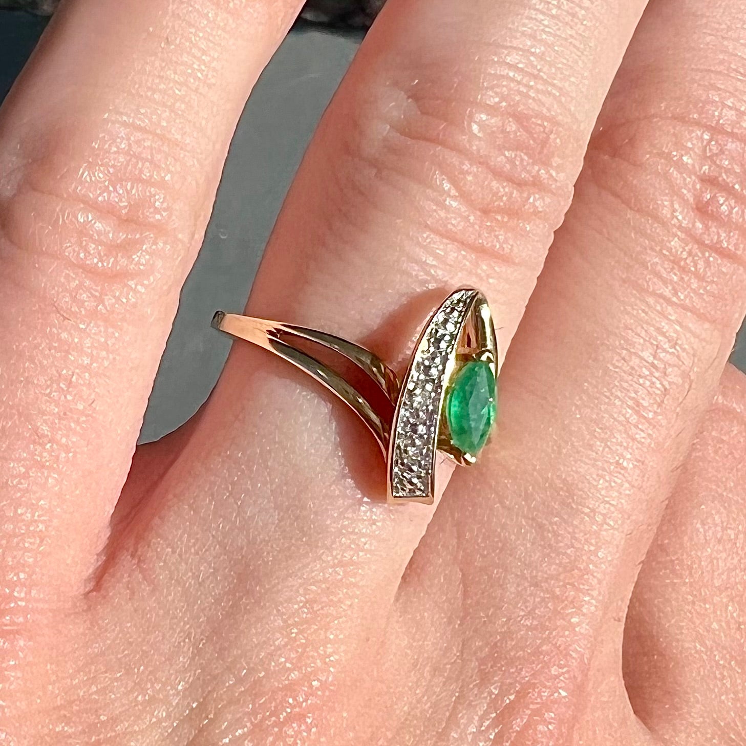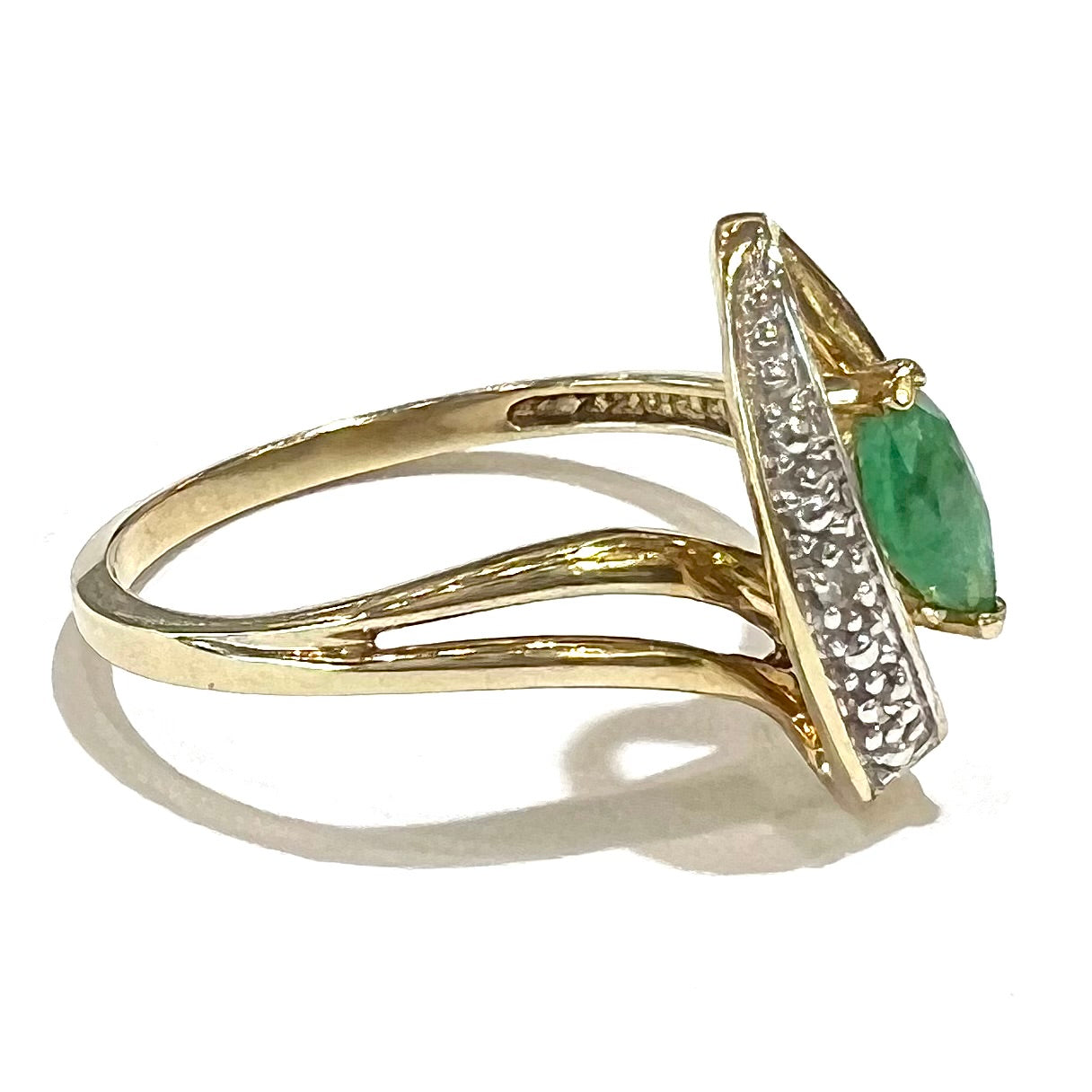 Bright marquise cut emerald set in stylish split shank ring with diamond and raised metal accents.