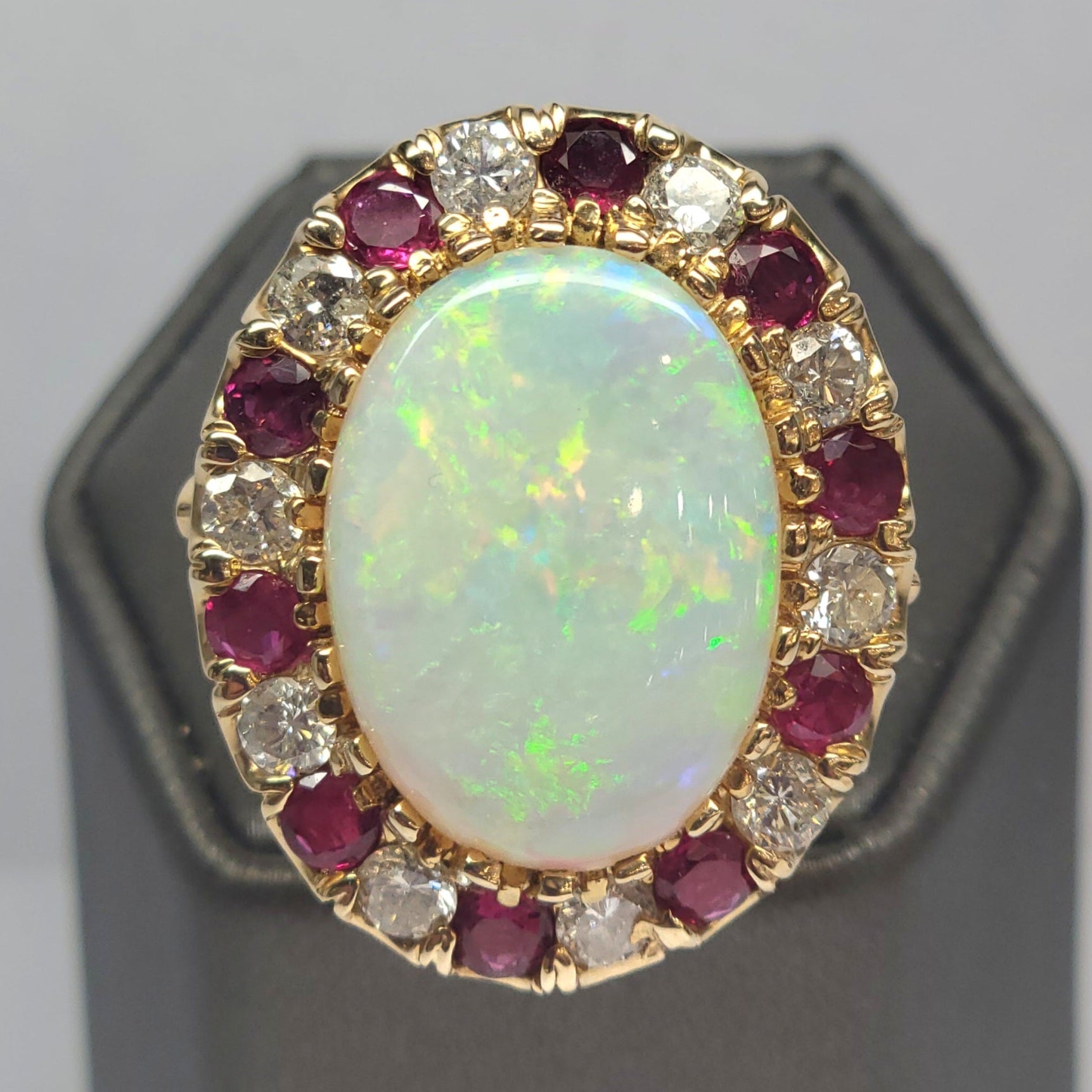 A stunning ladies' ring featuring an oval opal surrounded by Burma rubies and diamonds set in 14kt yellow gold.