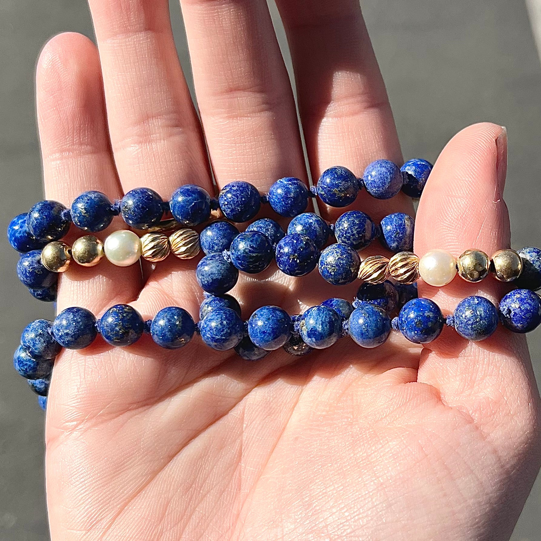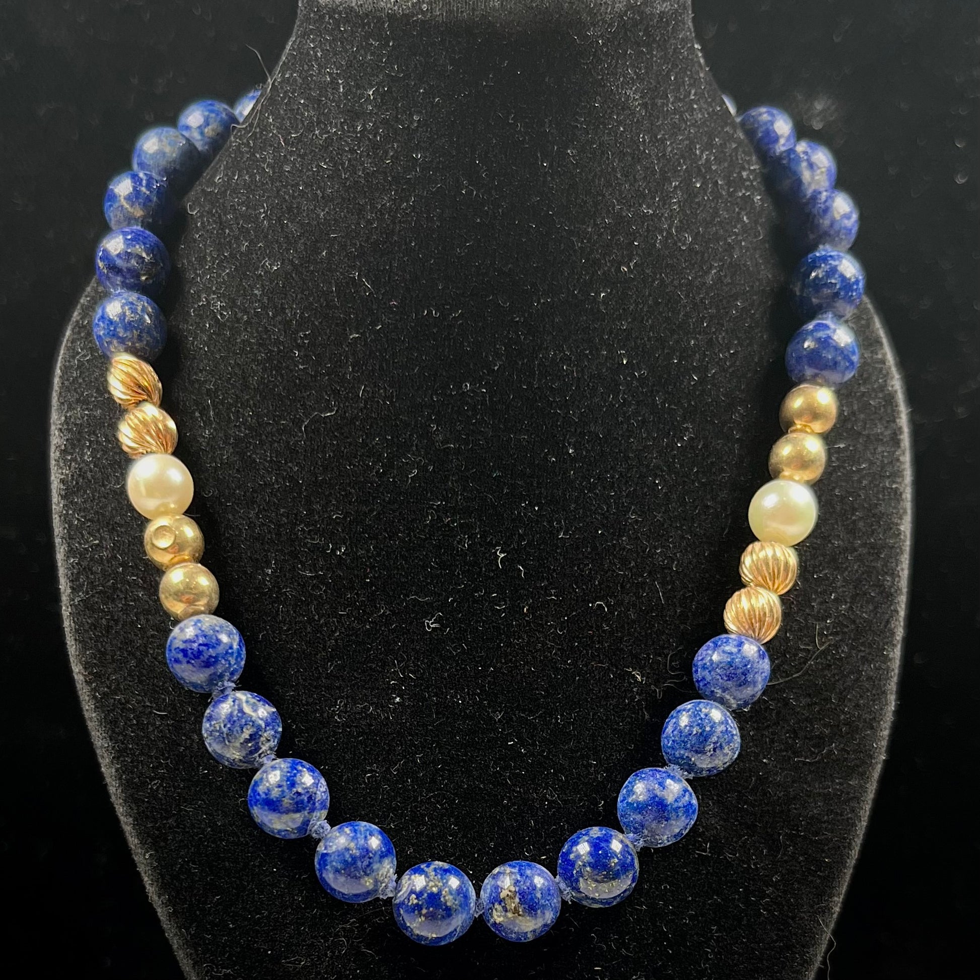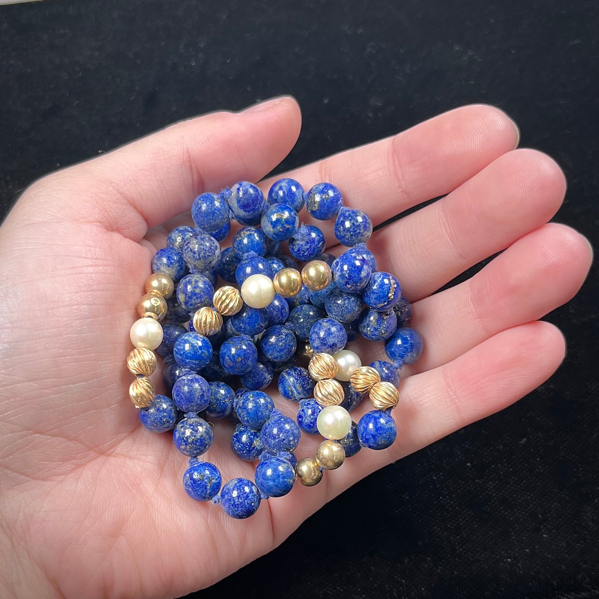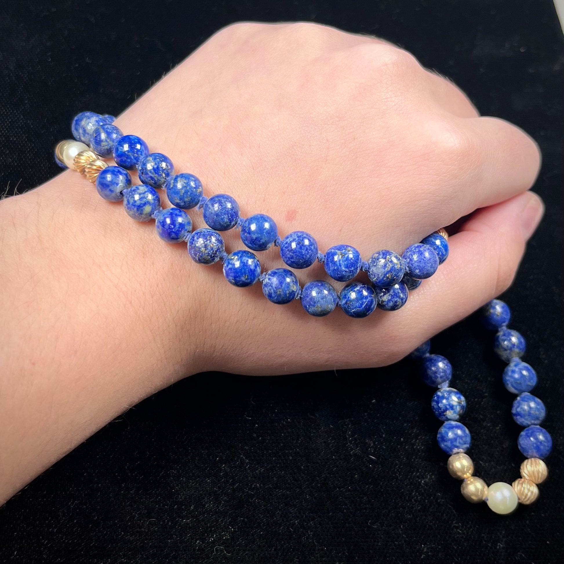 Lapis Lazuli Beaded Necklace with Gold and Pearl Bead accents - see wear report