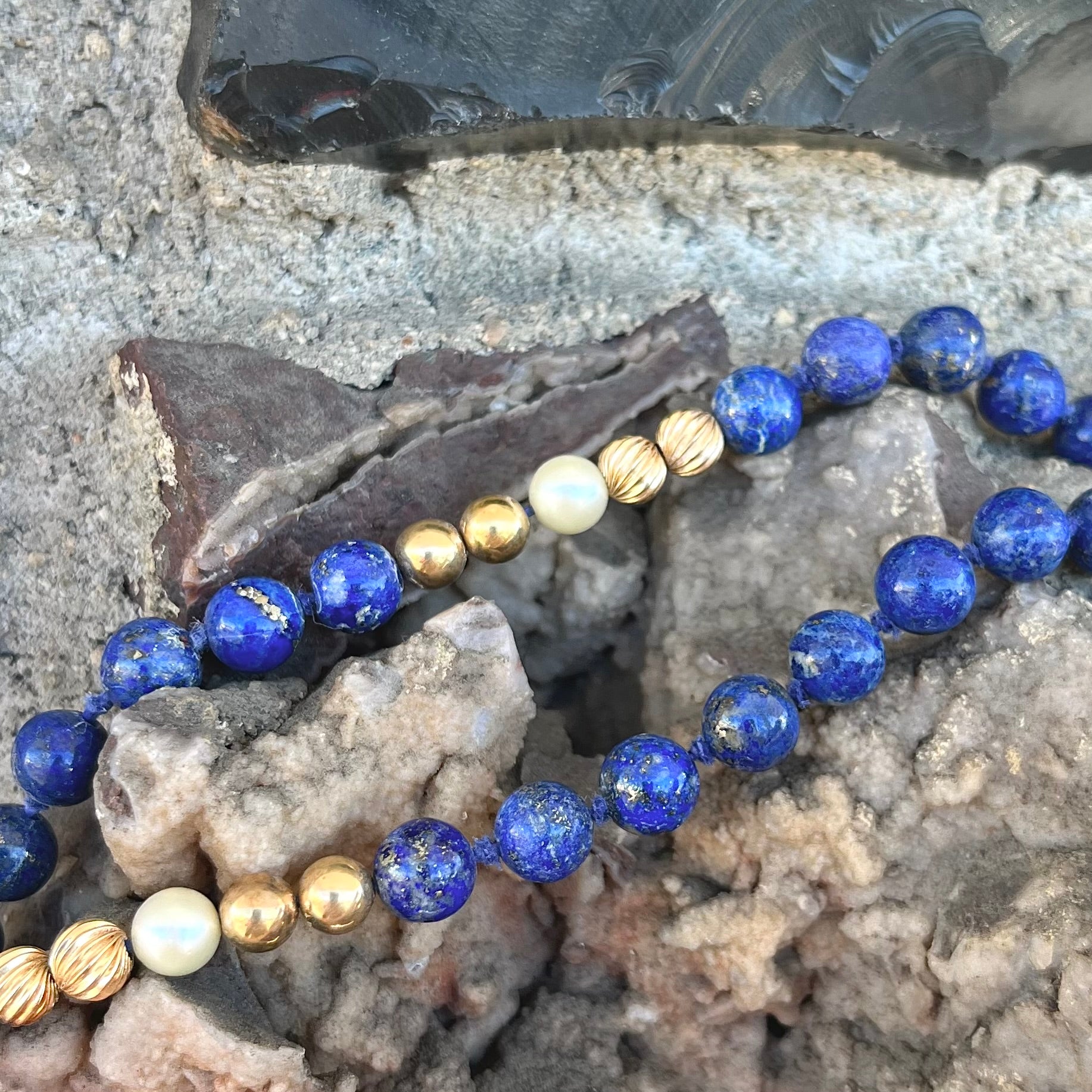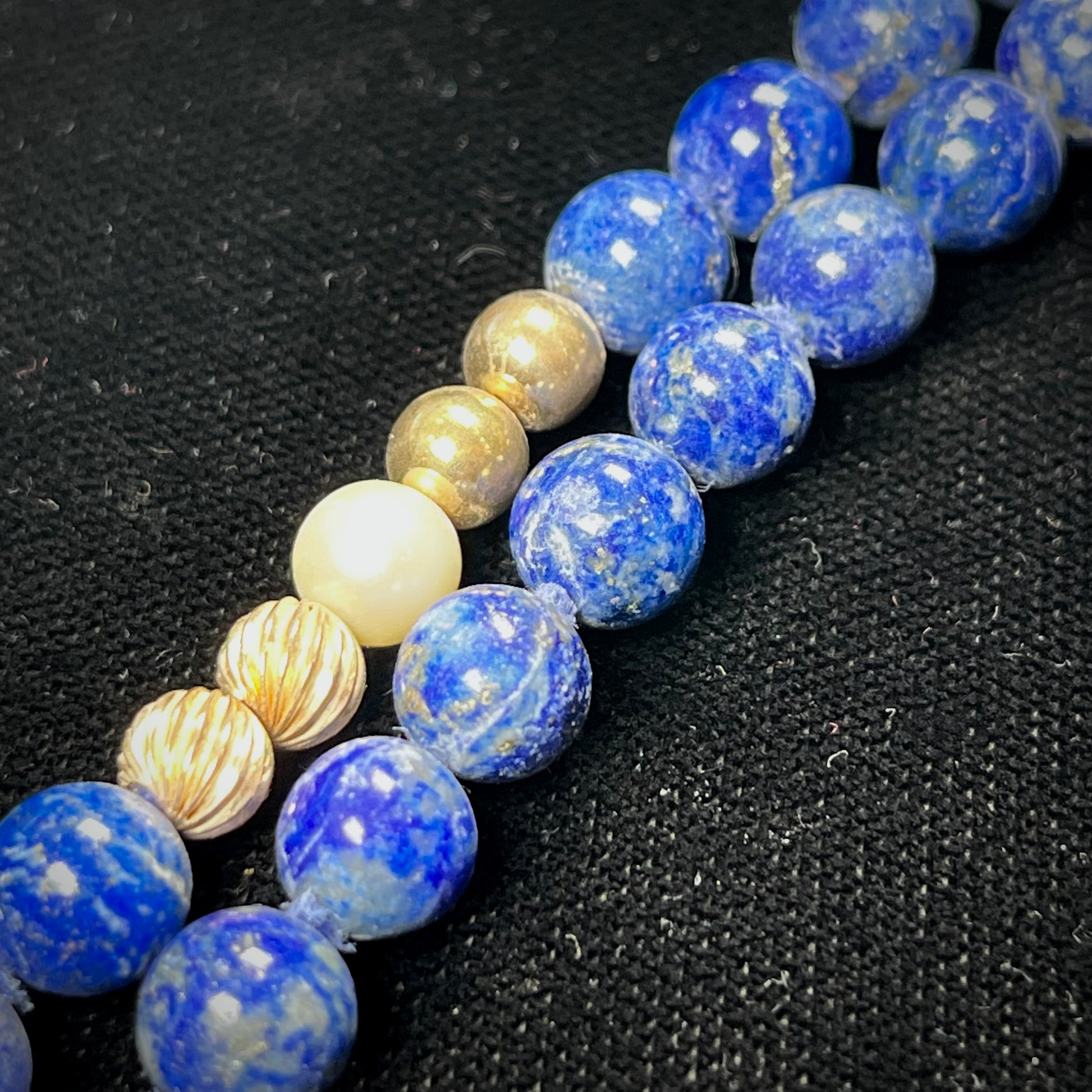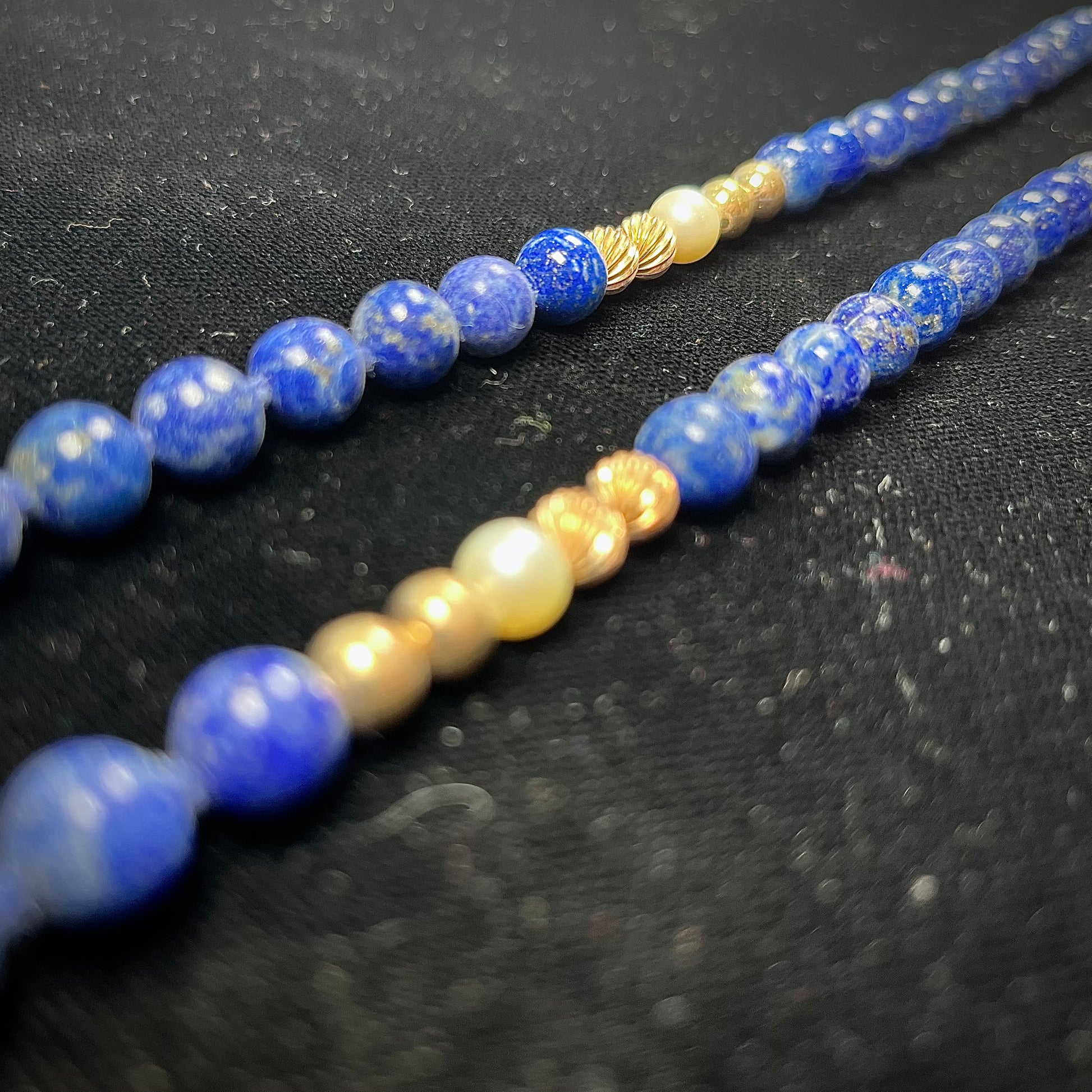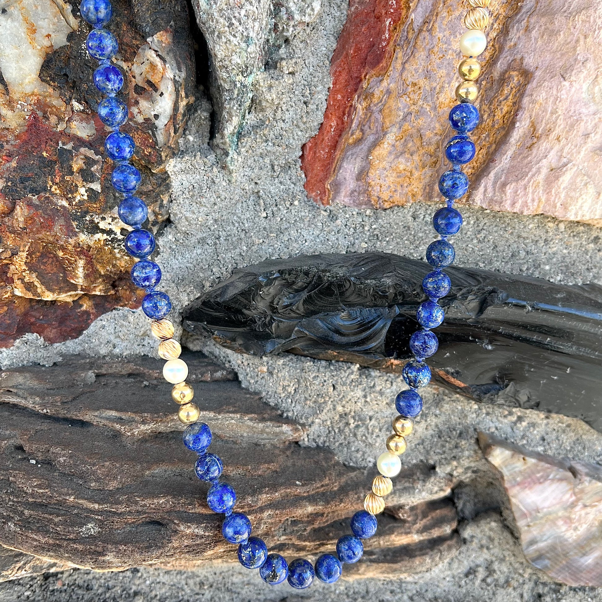 Lapis Lazuli Beaded Necklace with Gold and Pearl Bead accents - see wear report