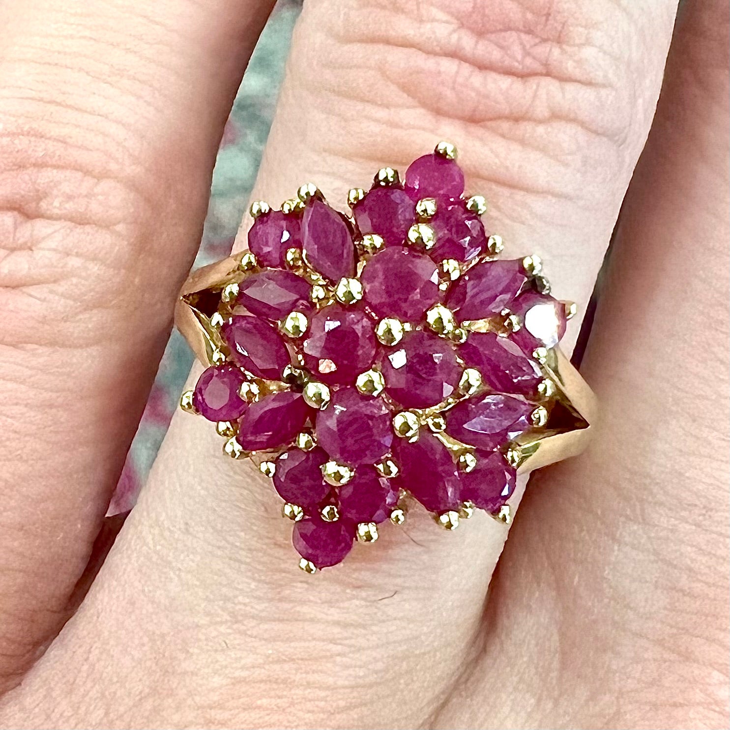 Cluster of Burma rubies prong set in a 10kt yellow gold split shank ring.