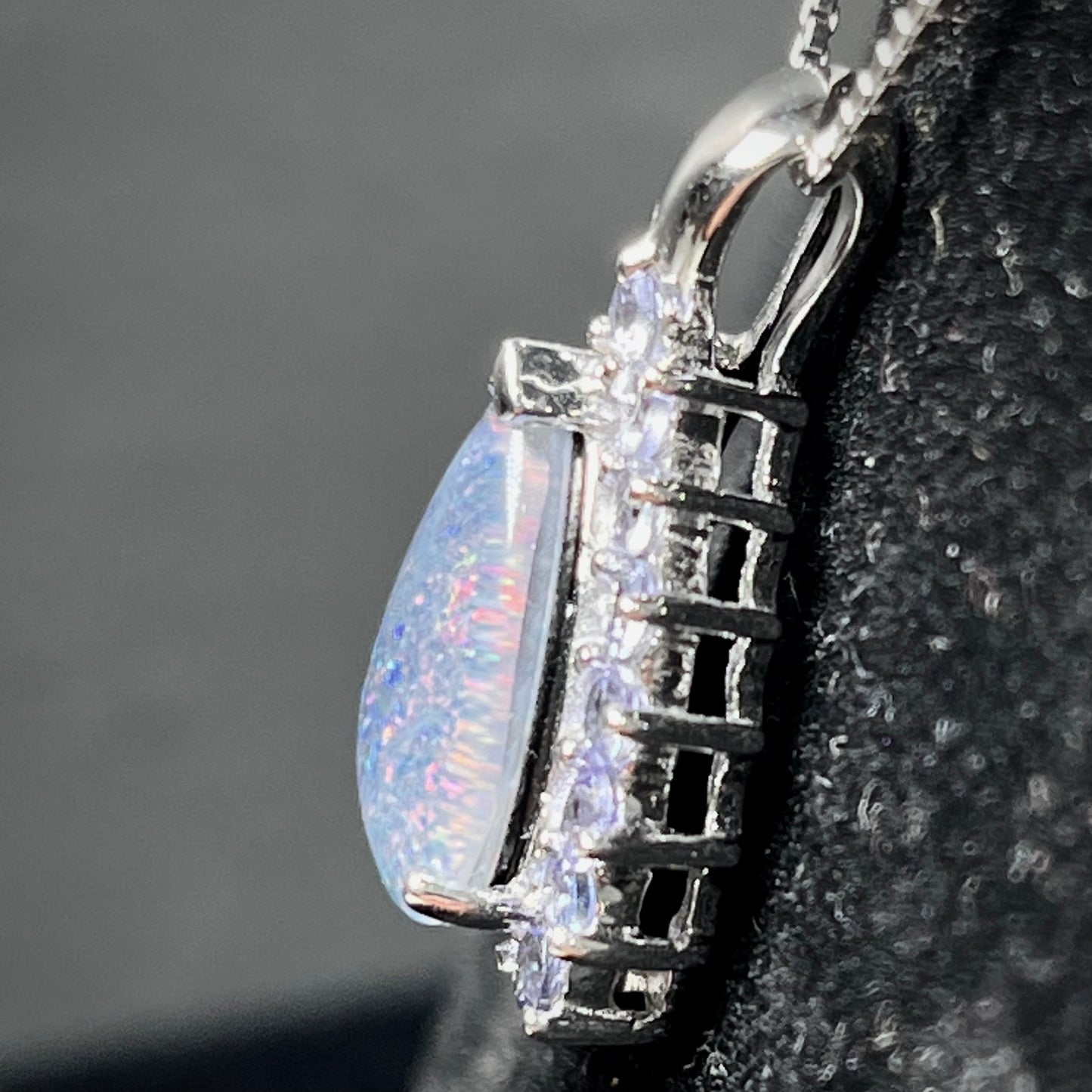 Triplet Pendants must be worn with care. It is advised not to wear doublet and triplet opals in water. Bright color stone with natural opal center and quartz top. "Triplets" are thin, natural opal stones that have been assembled between two pieces of material by man. A black base enhances color, and a clear quartz cap both magnifies color and improves scratch resistance.