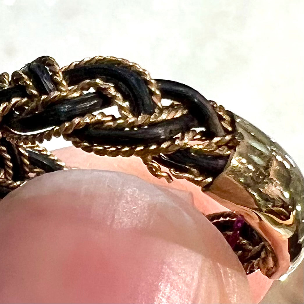 There is damage on to the braided gold on one side of the piece, as seen in the last photo. The integrity of the ring still appears to be intact, though we suggest the piece not be purchased for everyday wear.