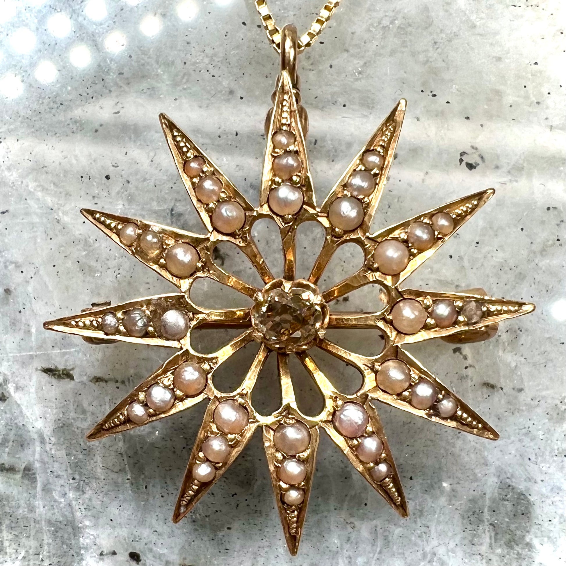 Victorian Diamond & Pearl Starburst Brooch | 14kt | Antique c.1800's