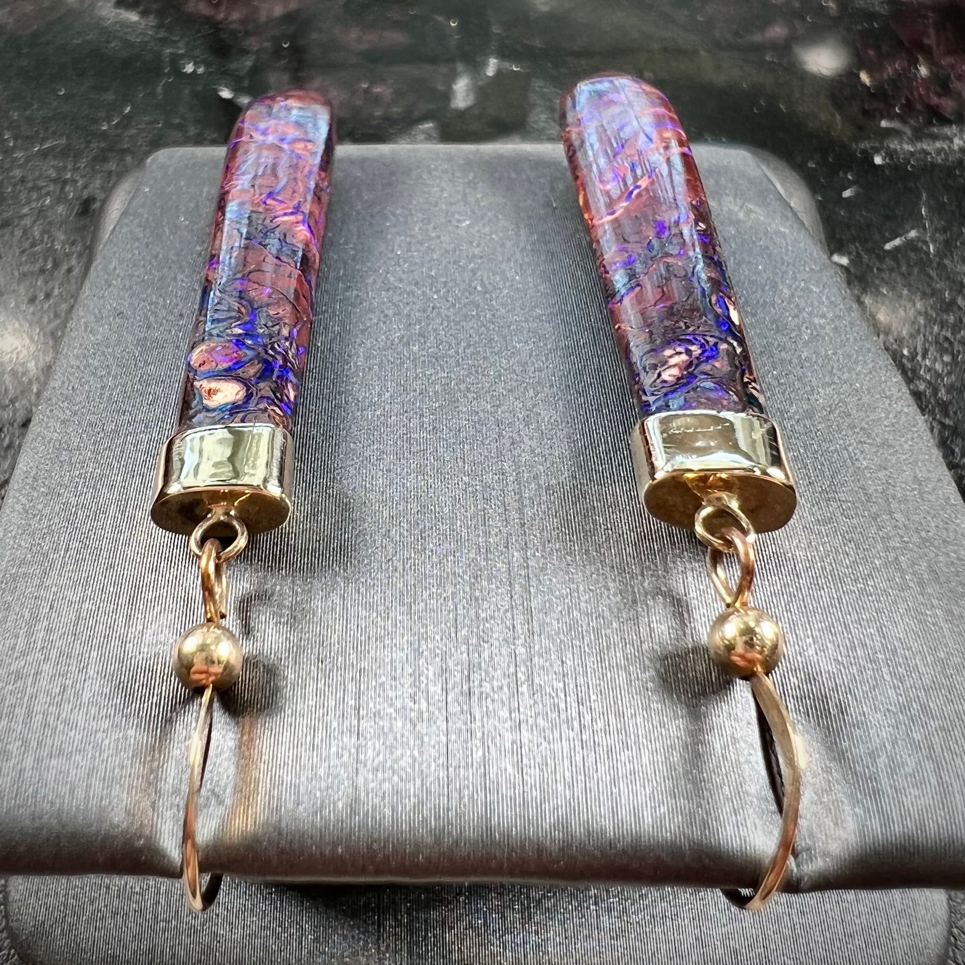 Custom cut, unique pattern polished drop boulder opal earrings that shine purple and green in the sunlight.